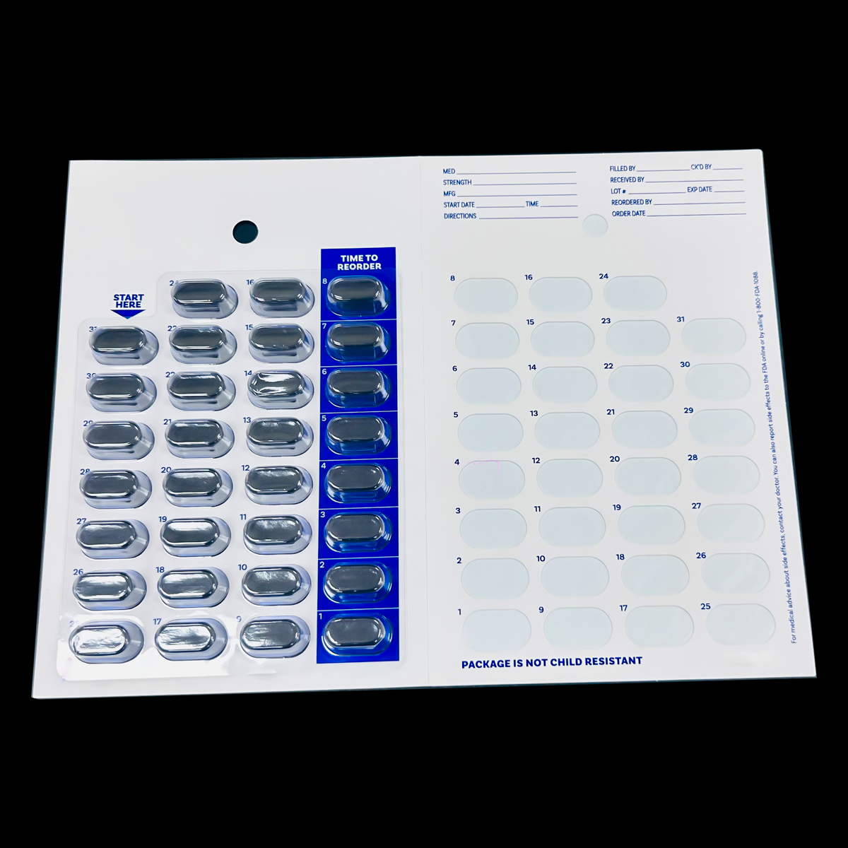 Our 31 Day Multi-med Monthly Cold Seal Medication Blister Pack Cards feature a convenient two-fold design for easy portability and storage.